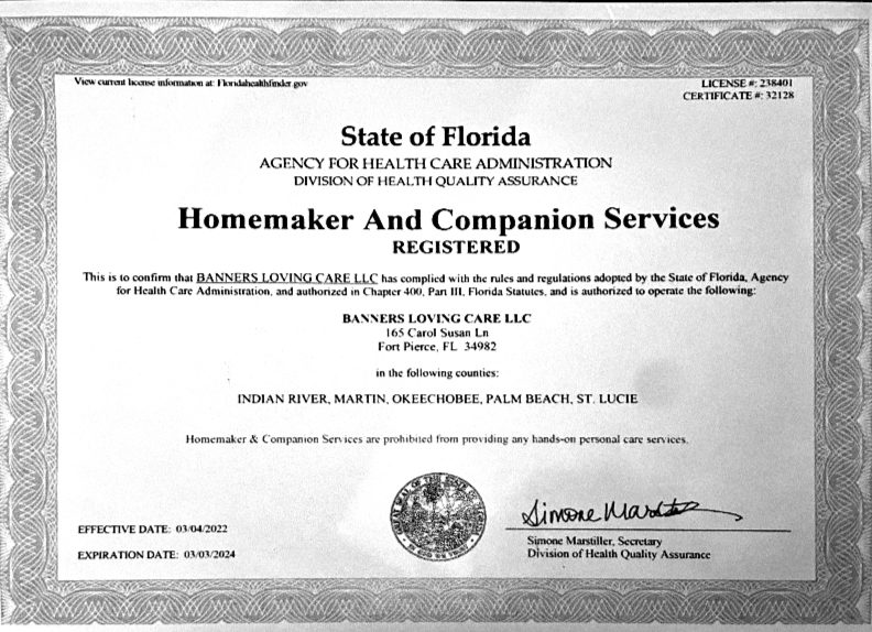 Banner's Loving Care is proud to provide Homemaker and Companion Services. We are registered in the state of Florida.